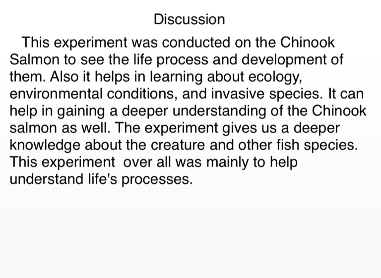 This experiment was conducted on the Chinook Salmon to see the life process and development of them. Also it helps in learning about ecology, environmental conditions, and invasive species. It can help in gaining a deeper understanding of the Chinook salmon as well. The experiment gives us a deeper knowledge about the creature and other fish species. This experiment over all was mainly to help understand life's processes.