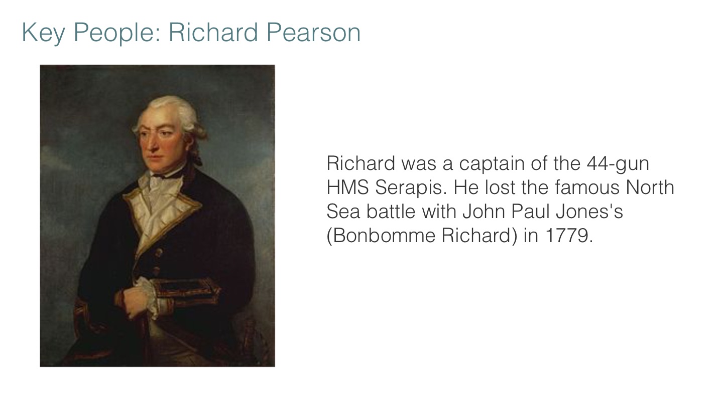 Richard was a captain of the 44-gun HMS Serapis. He lost the famous North Sea battle with John Paul Jones's (Bonbomme Richard) in 1779.