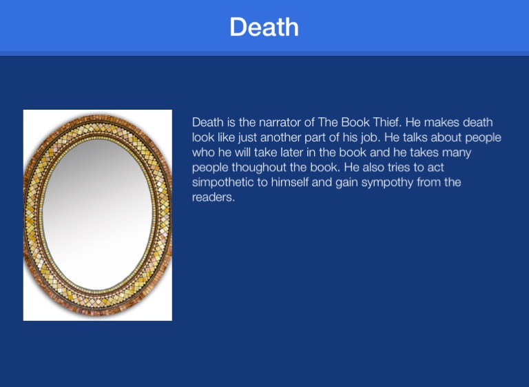 Death is the narrator of The Book Thief. He makes death look like just another part of his job. He talks about people who he will take later in the book and he takes many people thoughout the book. He also tries to act simpothetic to himself and gain sympothy from the readers.