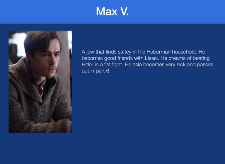 A jew that finds saftey in the Huberman household. He becomes good friends with Liesel. He dreams of beating Hitler in a fist fight. He aslo becomes very sick and passes out in part 6.