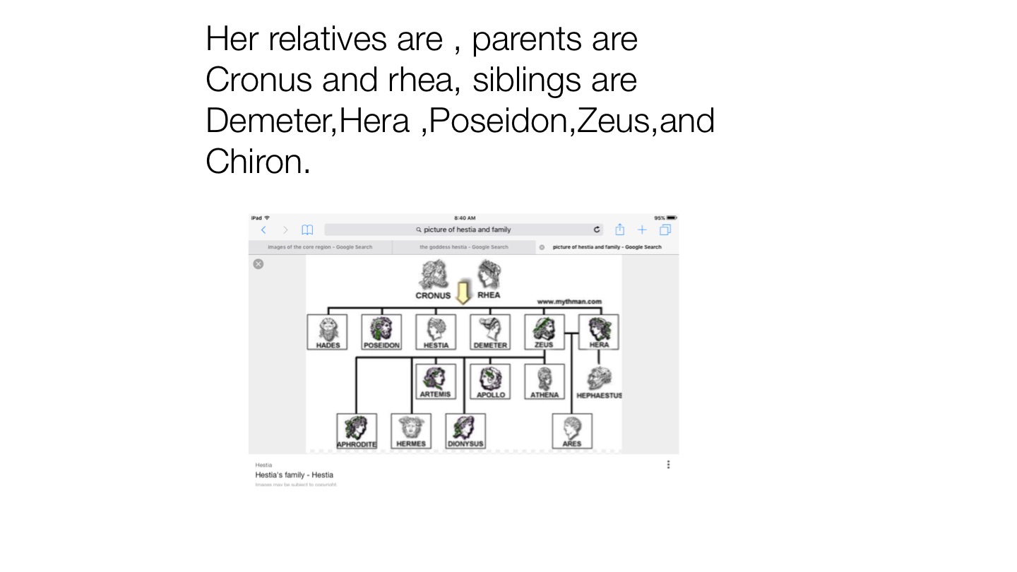 Her relatives are , parents are Cronus and rhea, siblings are Demeter,Hera ,Poseidon,Zeus,and Chiron.
