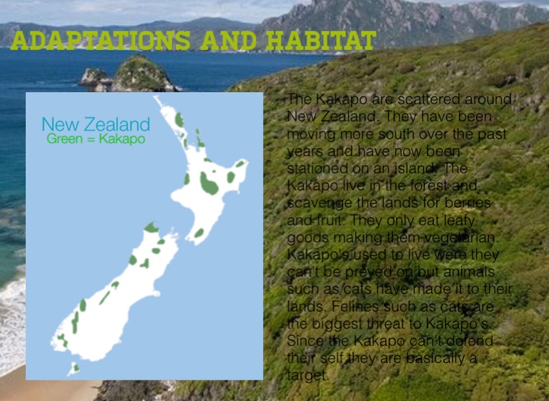 The Kakapo are scattered around New Zealand. They have been moving more south over the past years and have now been stationed on an island. The Kakapo live in the forest and scavenge the lands for berries and fruit. They only eat leafy goods making them vegetarian. Kakapo's used to live were they can't be preyed on but animals such as cats have made it to their lands. Felines such as cats are the biggest threat to Kakapo's. Since the Kakapo can't defend their self they are basically a target.