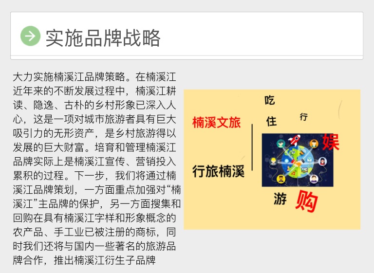 大力实施楠溪江品牌策略。在楠溪江近年来的不断发展过程中,楠溪江耕读、隐逸、古朴的乡村形象已深入人心,这是一项对城市旅游者具有巨大吸引力的无形资产,是乡村旅游得以发展的巨大财富。培育和管理楠溪江品牌实际上是楠溪江宣传、营销投入累积的过程。下一步,我们将通过楠溪江品牌策划,一方面重点加强对“楠溪江”主品牌的保护,另一方面搜集和回购在具有楠溪江字样和形象概念的农产品、手工业已被注册的商标,同时我们还将与国内一些著名的旅游品牌合作,推出楠溪江衍生子品牌