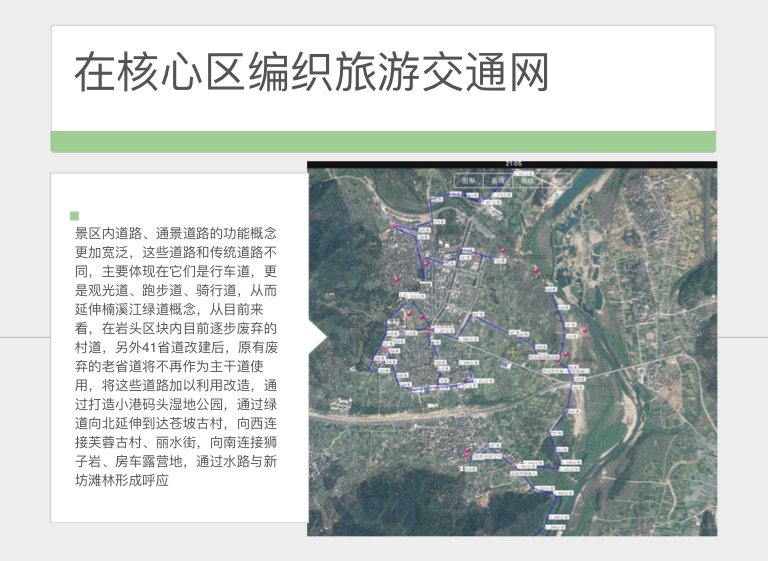 景区内道路、通景道路的功能概念更加宽泛,这些道路和传统道路不同,主要体现在它们是行车道,更是观光道、跑步道、骑行道,从而延伸楠溪江绿道概念,从目前来看,在岩头区块内目前逐步废弃的村道,另外41省道改建后,原有废弃的老省道将不再作为主干道使用,将这些道路加以利用改造,通过打造小港码头湿地公园,通过绿道向北延伸到达苍坡古村,向西连接芙蓉古村、丽水街,向南连接狮子岩、房车露营地,通过水路与新坊滩林形成呼应