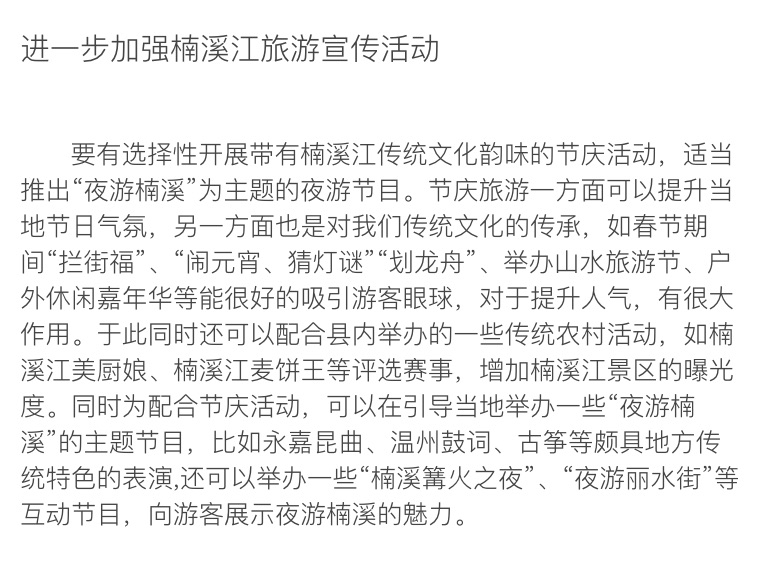 要有选择性开展带有楠溪江传统文化韵味的节庆活动,适当推出“夜游楠溪”为主题的夜游节目。节庆旅游一方面可以提升当地节日气氛,另一方面也是对我们传统文化的传承,如春节期间“拦街福”、“闹元宵、猜灯谜”“划龙舟”、举办山水旅游节、户外休闲嘉年华等能很好的吸引游客眼球,对于提升人气,有很大作用。于此同时还可以配合县内举办的一些传统农村活动,如楠溪江美厨娘、楠溪江麦饼王等评选赛事,增加楠溪江景区的曝光度。同时为配合节庆活动,可以在引导当地举办一些“夜游楠溪”的主题节目,比如永嘉昆曲、温州鼓词、古筝等颇具地方传统特色的表演,还可以举办一些“楠溪篝火之夜”、“夜游丽水街”等互动节目,向游客展示夜游楠溪的魅力。
