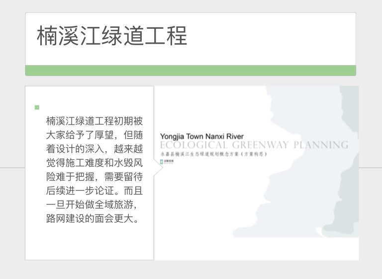 楠溪江绿道工程初期被大家给予了厚望,但随着设计的深入,越来越觉得施工难度和水毁风险难于把握,需要留待后续进一步论证。而且一旦开始做全域旅游,路网建设的面会更大。