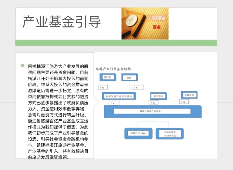困扰楠溪江旅游大产业发展的瓶颈问题主要还是资金问题,目前楠溪江还处于旅游大投入的前期阶段,维系大投入的资金拼盘来源渠道仍需进一步拓宽,原有的单纯依靠抵押或项目贷款的融资方式已逐步暴露出了政府负债压力大,资金使用效率低等弊端,急需对融资方式进行转型升级。浙江省旅游百亿产业基金成立运作模式为我们提供了借鉴,为此我们初步形成了产业引导基金的设想,引导社会资金金融机构参与,组建楠溪江旅游产业基金。产业基金的引入,将有效解决目前旅游发展融资难题。