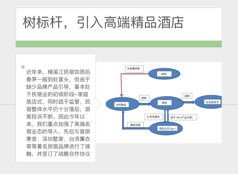 近年来,楠溪江民宿如雨后春笋一般到处冒头,但由于缺少品牌产品引导,基本处于民宿业的初级阶段--家庭旅店式,同时疏于监管,民宿整体水平仍十分落后,游客投诉不断。因此今年以来,我们重点加强了高端名宿业态的导入,先后与首旅寒舍、深圳墅家、台湾薰衣草等著名民宿品牌进行了接触,并签订了战略合作协议