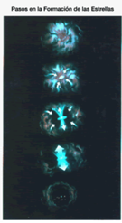 La fotmacion de las estrellas considera que estas nacen por la acumulacion de gas y polvo en un, lugar del espacio. Esta nube se contrae y se calienta hasta que en su centro empiezan las reacciones nucleares, que transforman la materia en energia.