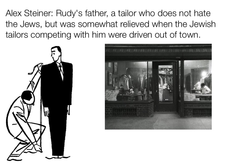 Alex Steiner: Rudy's father, a tailor who does not hate the Jews, but was somewhat relieved when the Jewish tailors competing with him were driven out of town.
