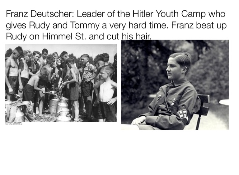 Franz Deutscher: Leader of the Hitler Youth Camp who gives Rudy and Tommy a very hard time. Franz beat up Rudy on Himmel St. and cut his hair.