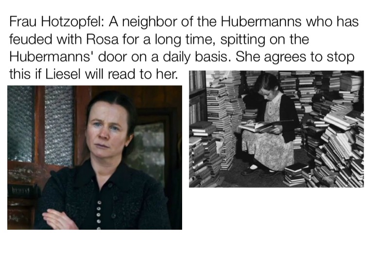 Frau Hotzopfel: A neighbor of the Hubermanns who has feuded with Rosa for a long time, spitting on the Hubermanns' door on a daily basis. She agrees to stop this if Liesel will read to her.