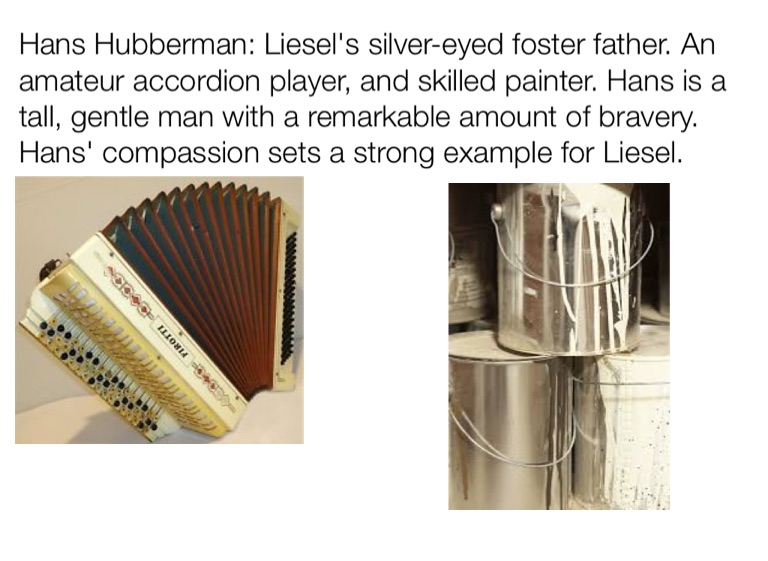 Hans Hubberman: Liesel's silver-eyed foster father. An amateur accordion player, and skilled painter. Hans is a tall, gentle man with a remarkable amount of bravery. Hans' compassion sets a strong example for Liesel.