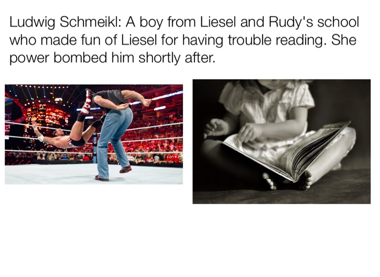 Ludwig Schmeikl: A boy from Liesel and Rudy's school who made fun of Liesel for having trouble reading. She power bombed him shortly after.