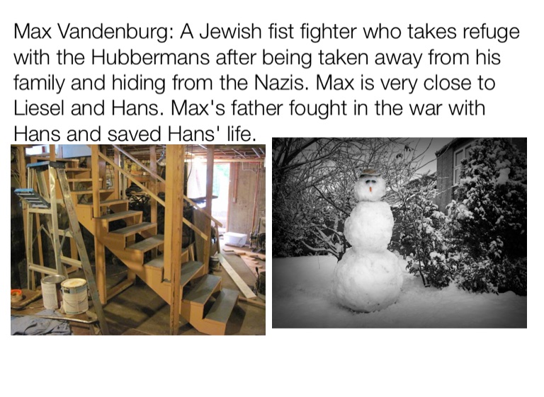 Max Vandenburg: A Jewish fist fighter who takes refuge with the Hubbermans after being taken away from his family and hiding from the Nazis. Max is very close to Liesel and Hans. Max's father fought in the war with Hans and saved Hans' life.