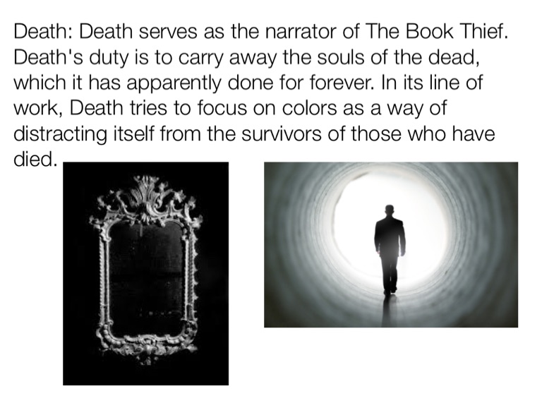Death: Death serves as the narrator of The Book Thief. Death's duty is to carry away the souls of the dead, which it has apparently done for forever. In its line of work, Death tries to focus on colors as a way of distracting itself from the survivors of those who have died.