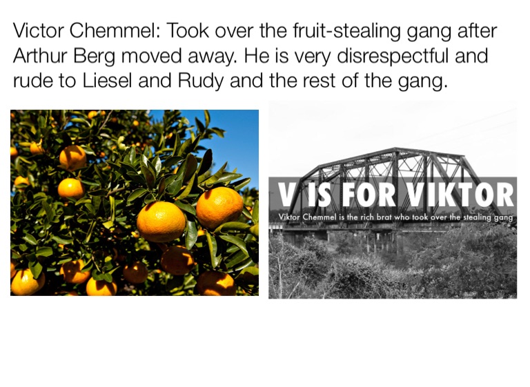 Victor Chemmel: Took over the fruit-stealing gang after Arthur Berg moved away. He is very disrespectful and rude to Liesel and Rudy and the rest of the gang.