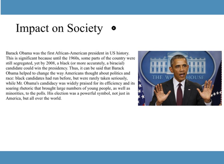 Barack Obama was the first African-American president in US history. This is significant because until the 1960s, some parts of the country were still segregated, yet by 2008, a black (or more accurately, a biracial) candidate could win the presidency. Thus, it can be said that Barack Obama helped to change the way Americans thought about politics and race: black candidates had run before, but were rarely taken seriously, while Mr. Obama's candidacy was widely praised for its efficiency and its soaring rhetoric that brought large numbers of young people, as well as minorities, to the polls. His election was a powerful symbol, not just in America, but all over the world.
