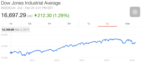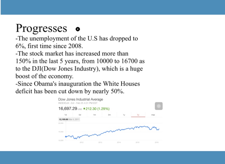 -The stock market has increased more than 150% in the last 5 years, from 10000 to 16700 as to the DJI(Dow Jones Industry), which is a huge boost of the economy.