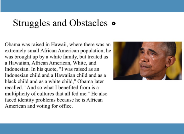 Obama was raised in Hawaii, where there was an extremely small African American population, he was brought up by a white family, but treated as a Hawaiian, African American, White, and Indonesian. In his quote, "I was raised as an Indonesian child and a Hawaiian child and as a black child and as a white child," Obama later recalled. "And so what I benefited from is a multiplicity of cultures that all fed me." He also faced identity problems because he is African American and voting for office.
