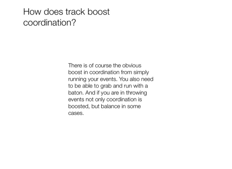 There is of course the obvious boost in coordination from simply running your events. You also need to be able to grab and run with a baton. And if you are in throwing events not only coordination is boosted, but balance in some cases.