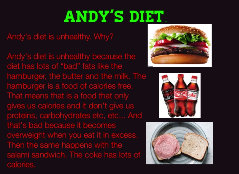Andy's diet is unhealthy because the diet has lots of “bad” fats like the hamburger, the butter and the milk. The hamburger is a food of calories free. That means that is a food that only gives us calories and it don't give us proteins, carbohydrates etc, etc... And that's bad because it becomes overweight when you eat it in excess. Then the same happens with the salami sandwich. The coke has lots of calories.