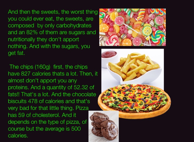 And then the sweets, the worst thing you could ever eat, the sweets, are composed by only carbohydrates and an 82% of them are sugars and nutritionally they don't apport nothing. And with the sugars, you get fat.