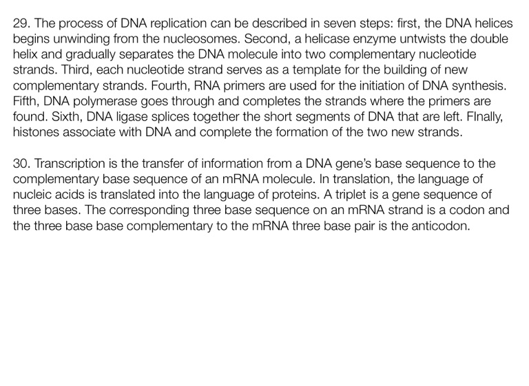 29. The process of DNA replication can be described in seven steps: first, the DNA helices begins unwinding from the nucleosomes. Second, a helicase enzyme untwists the double helix and gradually separates the DNA molecule into two complementary nucleotide strands. Third, each nucleotide strand serves as a template for the building of new complementary strands. Fourth, RNA primers are used for the initiation of DNA synthesis. Fifth, DNA polymerase goes through and completes the strands where the primers are found. Sixth, DNA ligase splices together the short segments of DNA that are left. FInally, histones associate with DNA and complete the formation of the two new strands.