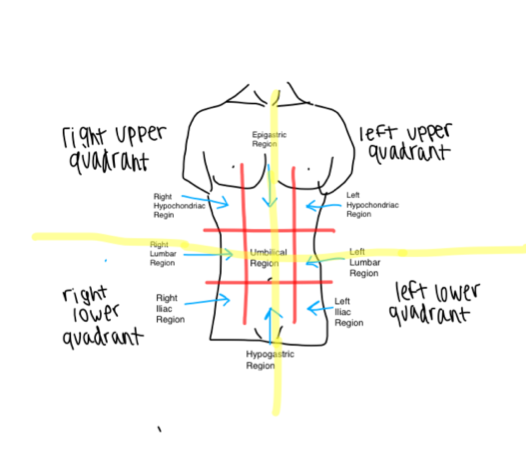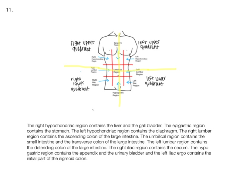 The right hypochondriac region contains the liver and the gall bladder. The epigastric region contains the stomach. The left hypochondriac region contains the diaphragm. The right lumbar region contains the ascending colon of the large intestine. The umbilical region contains the small intestine and the transverse colon of the large intestine. The left lumbar region contains the defending colon of the large intestine. The right iliac region contains the cecum. The hypo gastric region contains the appendix and the urinary bladder and the left iliac ergo contains the initial part of the sigmoid colon.