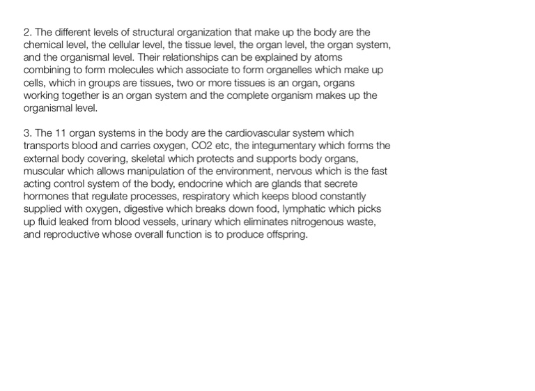 2. The different levels of structural organization that make up the body are the chemical level, the cellular level, the tissue level, the organ level, the organ system, and the organismal level. Their relationships can be explained by atoms combining to form molecules which associate to form organelles which make up cells, which in groups are tissues, two or more tissues is an organ, organs working together is an organ system and the complete organism makes up the organismal level.