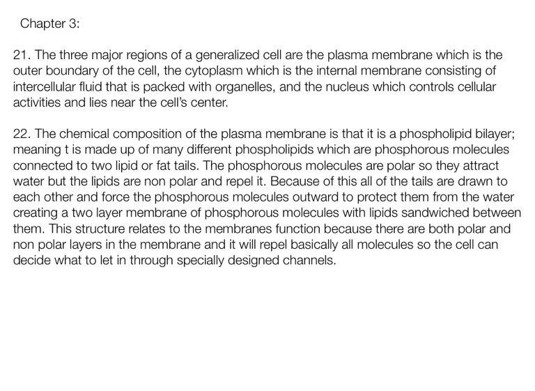 22. The chemical composition of the plasma membrane is that it is a phospholipid bilayer; meaning t is made up of many different phospholipids which are phosphorous molecules connected to two lipid or fat tails. The phosphorous molecules are polar so they attract water but the lipids are non polar and repel it. Because of this all of the tails are drawn to each other and force the phosphorous molecules outward to protect them from the water creating a two layer membrane of phosphorous molecules with lipids sandwiched between them. This structure relates to the membranes function because there are both polar and non polar layers in the membrane and it will repel basically all molecules so the cell can decide what to let in through specially designed channels.