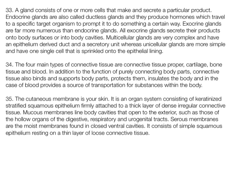 33. A gland consists of one or more cells that make and secrete a particular product. Endocrine glands are also called ductless glands and they produce hormones which travel to a specific target organism to prompt it to do something a certain way. Exocrine glands are far more numerous than endocrine glands. All exocrine glands secrete their products onto body surfaces or into body cavities. Multicellular glands are very complex and have an epithelium derived duct and a secretory unit whereas unicellular glands are more simple and have one single cell that is sprinkled onto the epithelial lining.