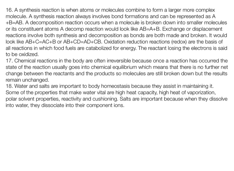 16. A synthesis reaction is when atoms or molecules combine to form a larger more complex molecule. A synthesis reaction always involves bond formations and can be represented as A+B=AB. A decomposition reaction occurs when a molecule is broken down into smaller molecules or its constituent atoms A decomp reaction would look like AB=A+B. Exchange or displacement reactions involve both synthesis and decomposition as bonds are both made and broken. It would look like AB+C=AC+B or AB+CD=AD+CB. Oxidation reduction reactions (redox) are the basis of all reactions in which food fuels are catabolized for energy. The reactant losing the electrons is said to be oxidized.