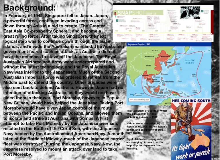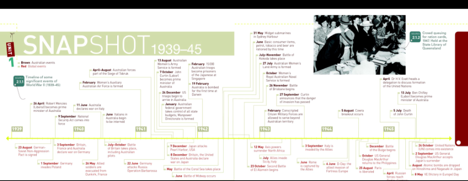 Top: Snapshot of events of World War 2 from 1939 to 1945, including Kokoda in 1942.