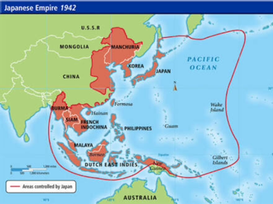 Middle: Areas controlled by Japan as of 1942. Shows Japan's power, and geography of area they owned.