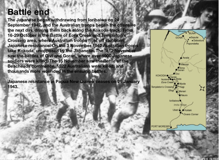 The Japanese began withdrawing from Ioribaiwa on 24 September 1942, and the Australian troops began the offensive the next day, driving them back along the Kokoda track. From 16-29 October is the Battle of Eora Creek and Templeton's Crossing area, where Australian troops fight off stubborn Japanese resistance. On the 3 November 1942 Australian troops take Kokoda, unopposed by the Japanese. The 5-12 November saw the battles of Oivi and Gorari, where over 1000 Japanese soldiers were killed. The 15 November saw the Battle of the Beacheads commence. 1522 Australians were killed, and thousands more wounded in the ensuing battles.