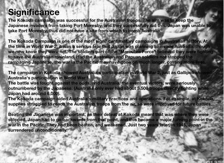The Kokoda Campaign is one of the most significant military campaigns in Australian history. At the time in World War 2, it was a serious fear that Japan was planning to invade Australia, though we now know they were not. The soldiers part of the "Maroubra Force" believed they were fighting to save the Australian mainland. Had the Australian and Papuan soldiers not stopped the rampaging Japanese, the war in the Pacific may have gone on much longer, costing more lives.