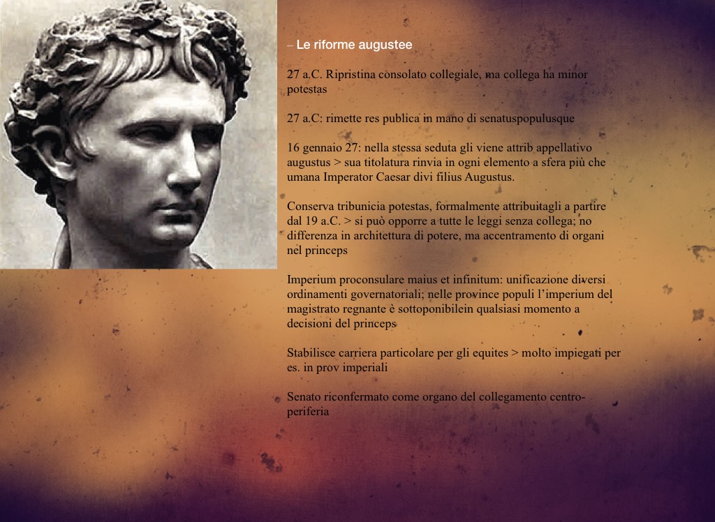 Conserva tribunicia potestas, formalmente attribuitagli a partire dal 19 a.C. > si può opporre a tutte le leggi senza collega; no differenza in architettura di potere, ma accentramento di organi nel princeps