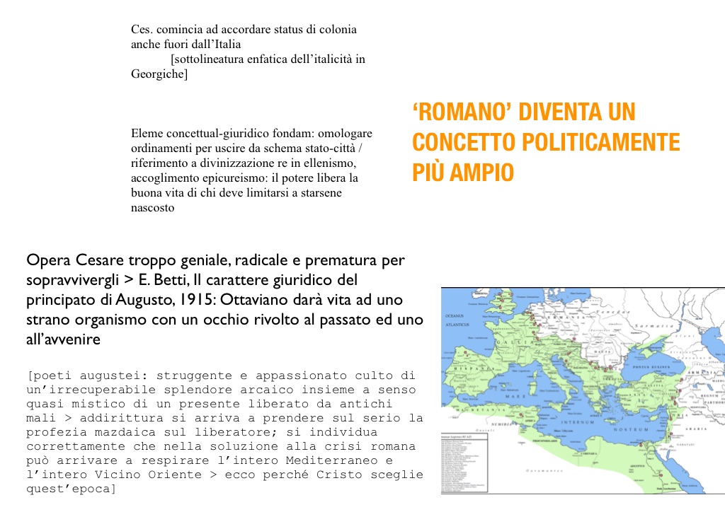 [poeti augustei: struggente e appassionato culto di un’irrecuperabile splendore arcaico insieme a senso quasi mistico di un presente liberato da antichi mali > addirittura si arriva a prendere sul serio la profezia mazdaica sul liberatore; si individua correttamente che nella soluzione alla crisi romana può arrivare a respirare l’intero Mediterraneo e l’intero Vicino Oriente > ecco perché Cristo sceglie quest’epoca]