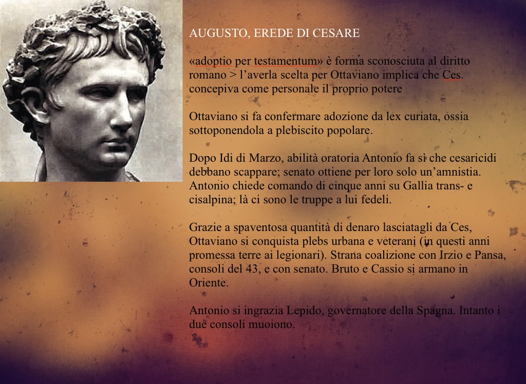 Grazie a spaventosa quantità di denaro lasciatagli da Ces, Ottaviano si conquista plebs urbana e veterani (in questi anni promessa terre ai legionari). Strana coalizione con Irzio e Pansa, consoli del 43, e con senato. Bruto e Cassio si armano in Oriente.