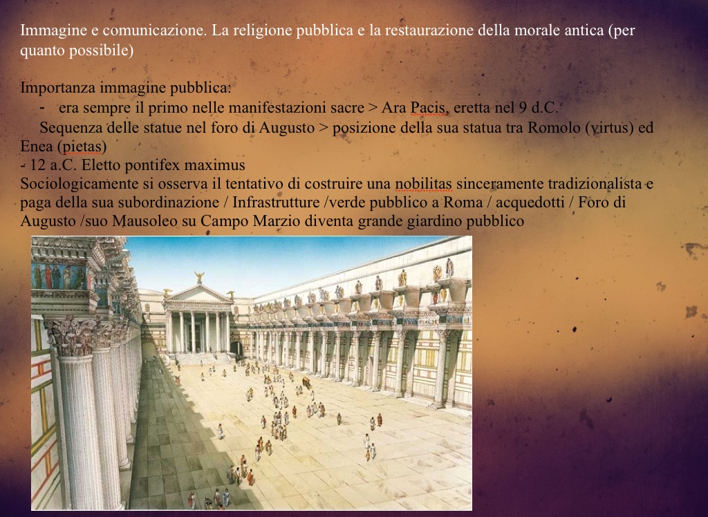 Sociologicamente si osserva il tentativo di costruire una nobilitas sinceramente tradizionalista e paga della sua subordinazione / Infrastrutture /verde pubblico a Roma / acquedotti / Foro di Augusto /suo Mausoleo su Campo Marzio diventa grande giardino pubblico