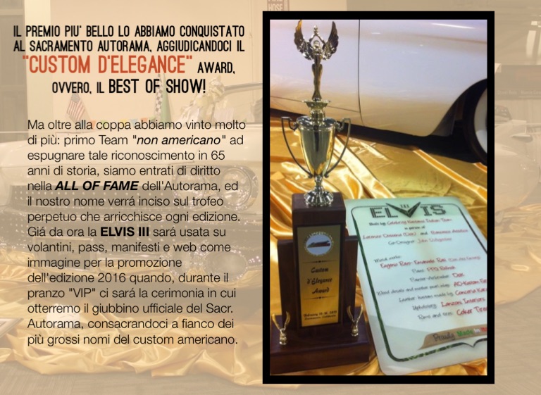 Il premio piu' bello lo abbiamo conquistato al Sacramento Autorama, aggiudicandoci il "CUSTOM D'ELEGANCE" Award, ovvero, il Best of Show!