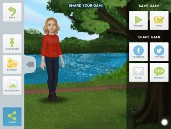 If you press the "share" button in the bottom left corner, a variety of options will appear, as well as the save button. You can either show your Tellagami to your friends or save it for yourself.