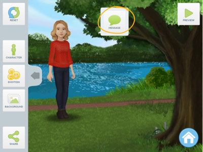 Once you have selected the "message" button, it should take you to the bottom right screen. Here, there are many options. You can record your voice to make your Tellagami speak, or you can enter in text and give your Tellagami a different voice (text is for the premium version only). You can make the message longer (premium) and preview your message.