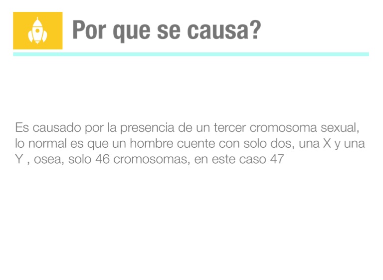 Es causado por la presencia de un tercer cromosoma sexual, lo normal es que un hombre cuente con solo dos, una X y una Y , osea, solo 46 cromosomas, en este caso 47
