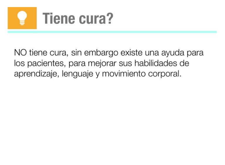 NO tiene cura, sin embargo existe una ayuda para los pacientes, para mejorar sus habilidades de aprendizaje, lenguaje y movimiento corporal.