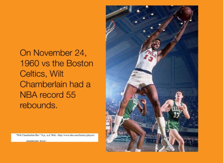 On November 24, 1960 vs the Boston Celtics, Wilt Chamberlain had a NBA record 55 rebounds.