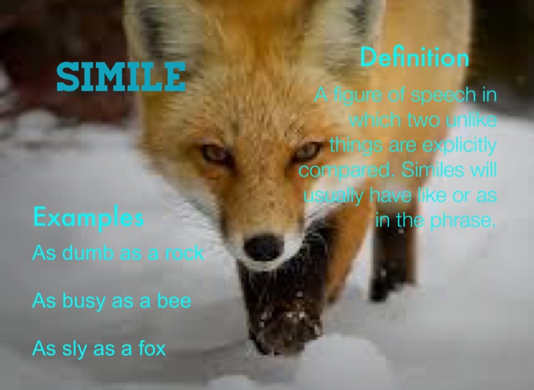 A figure of speech in which two unlike things are explicitly compared. Similes will usually have like or as in the phrase.