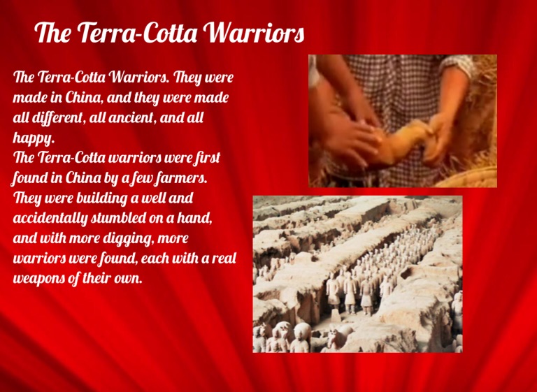 The Terra-Cotta warriors were first found in China by a few farmers. They were building a well and accidentally stumbled on a hand, and with more digging, more warriors were found, each with a real weapons of their own.