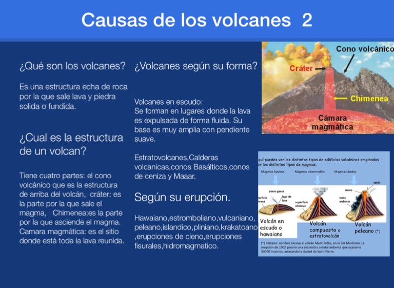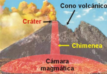 Tiene cuatro partes: el cono volcánico que es la estructura de arriba del volcán, cráter: es la parte por la que sale el magma, Chimenea:es la parte por la que asciende el magma.